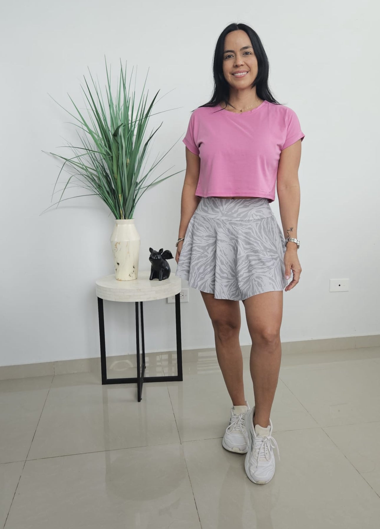 Este set está diseñado para mujeres que entrenan con actitud y estilo. El top en tono violeta vibrante se combina a la perfección con un skort gris con estampado tipo zebra, creando un look dinámico y moderno.